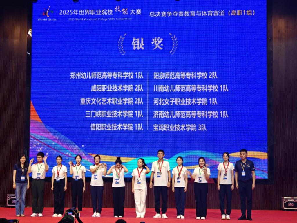 8月31日,2025年世界职业院校技能大赛“教育与体育赛道”(高职一组)总决赛在湖南长沙落下帷幕。 三门峡职业技术学院参赛团队与来自全国31个省、市、自治区的119支代表队同台竞技,凭借过硬的专业功底、无缝的团队协作与突破创新的实战能力勇夺银奖,较去年的铜奖实现再次跃升和突破。