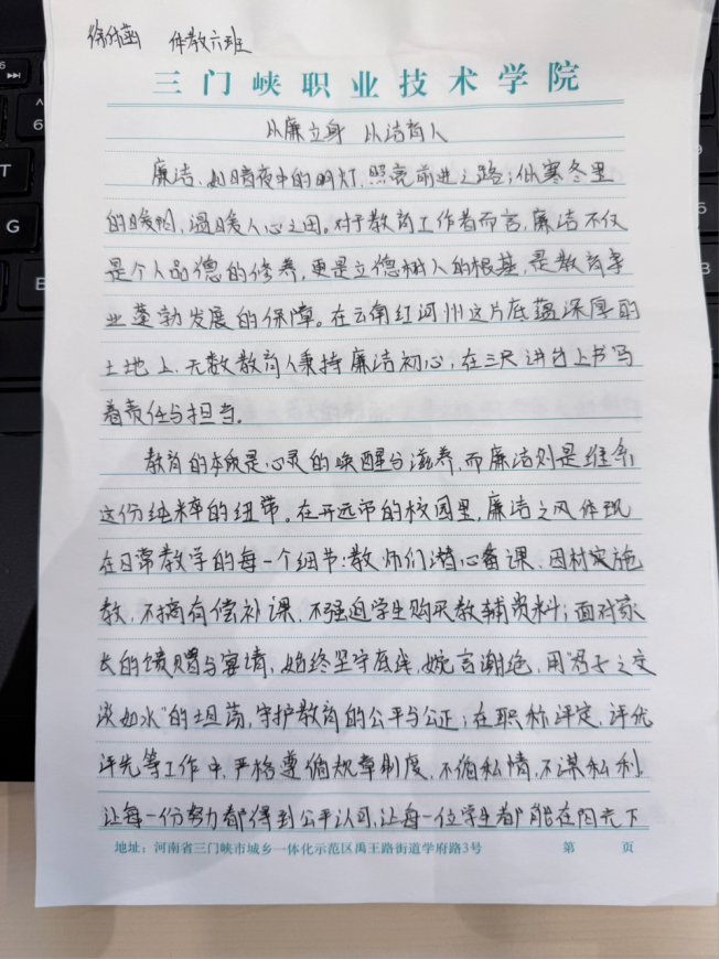 活动期间,学院墙面集中展示了多篇主题征文。征文内容涵盖教育初心、师德师风、青春理想等多个维度。整洁排列的文稿以“廉韵润三职·奋进新时代”为总领,内容紧扣廉洁修身、立德树人的核心,结合体育专业特色与自身感悟创作征文。体育人在赛场上的公平竞争、对规则的坚守,成为他们诠释廉洁的生动素材。