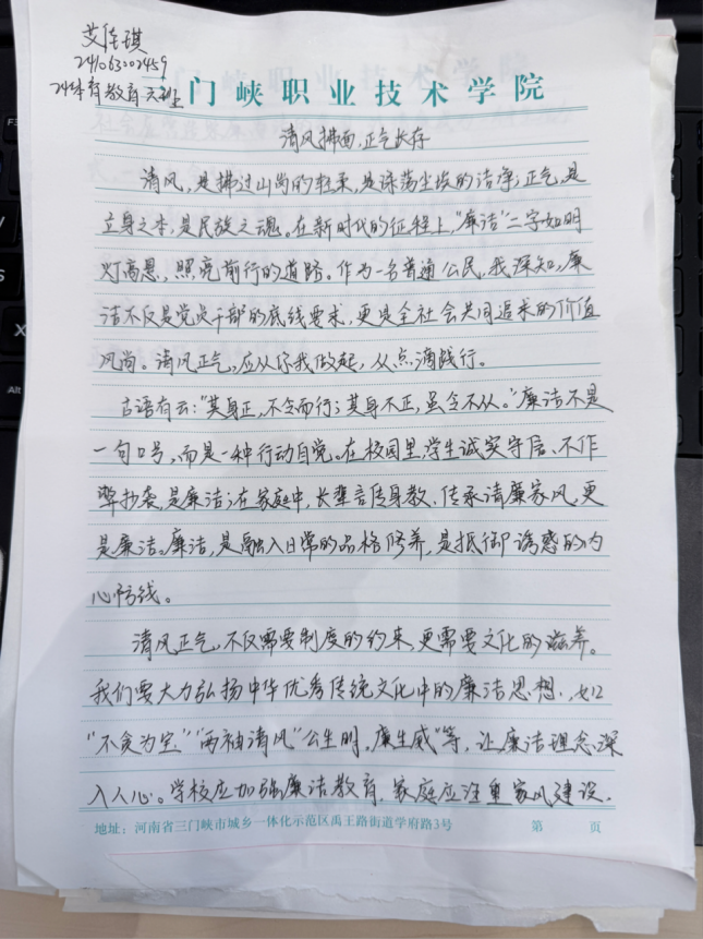tyc522cc太阳成集团徐华菡同学在《从廉立身 以洁育人》中写道:“廉洁是教育事业蓬勃发展的保障,教师应以‘君子之交淡如水’的坦荡守护教育公平”;艾佳琪同学在《清风拂面,正气长存》中强调:“廉洁需知行合一,从校园诚信、家风传承到社会风尚,皆需清风涤荡。”这些文章结合教育实践与个人感悟,展现了青年学子对廉洁文化的深刻理解。