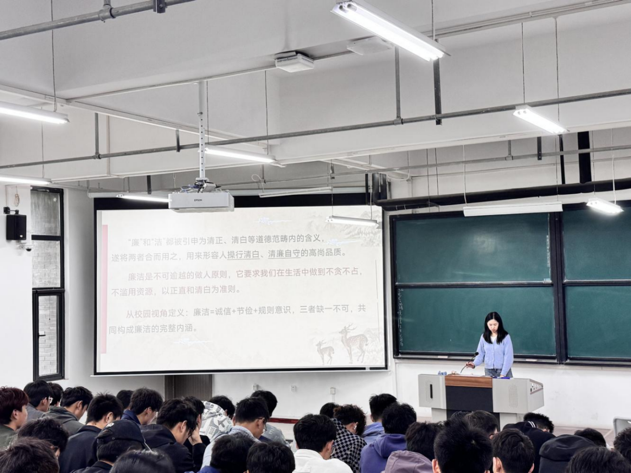 班会焦树立正确世界观、人生观、价值观核心目标,以丰富多样的形式深化廉洁教育实效。班会上,团支部书记韩云结合校园奖助学金评定、社团干部选举等常见场景,生动讲解廉洁自律的重要意义,不仅系统学习了校纪校规和大学生行为准则。还结合体育专业特点,深入剖析了赛事公平、诚信应试、团队协作等方面可能存在的廉洁风险点。通过生动的正反典型案例分析,着重强调“廉洁是立身之本,纪律是前行之基”,系统阐释了“廉洁”的内涵——既是“品行清白、清廉自守”的品质,在校园视角下也等同于“诚信+节俭+规则意识”的结合,并列举了形式主义、官僚主义等校园“四风”风险点,提醒新生警惕日常中的廉洁隐患,叮嘱新生要从入学之初就守住小节、远离红线。