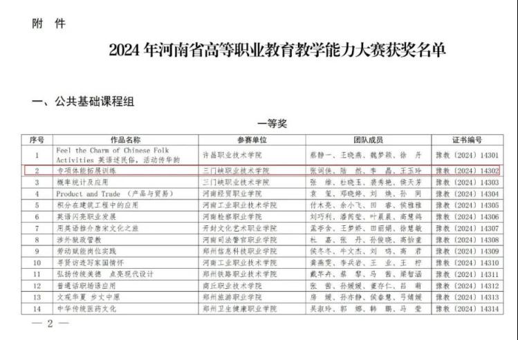 教师团队在省级教学能力大赛中屡创佳绩:2024年,张词侠团队凭借《专项体能拓展训练》斩获省赛一等奖;2025年,陆然团队再度问鼎一等奖。学生技能竞赛同样硕果累累:2023年包揽河南省体育活动设计与实施赛项3个一等奖。
